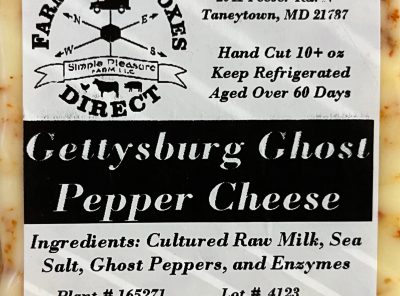 Delicious raw milk cheddar cheese paired with spicy ghost peppers. Even heat through the entire eating adventure! Stop by for the Gettysburg Ghost Family Challenge ! Handcrafted in Chambersburg, Pa by Homestead Cheese Crafters using Simple Pleasures Dairy Farms Raw Milk. -